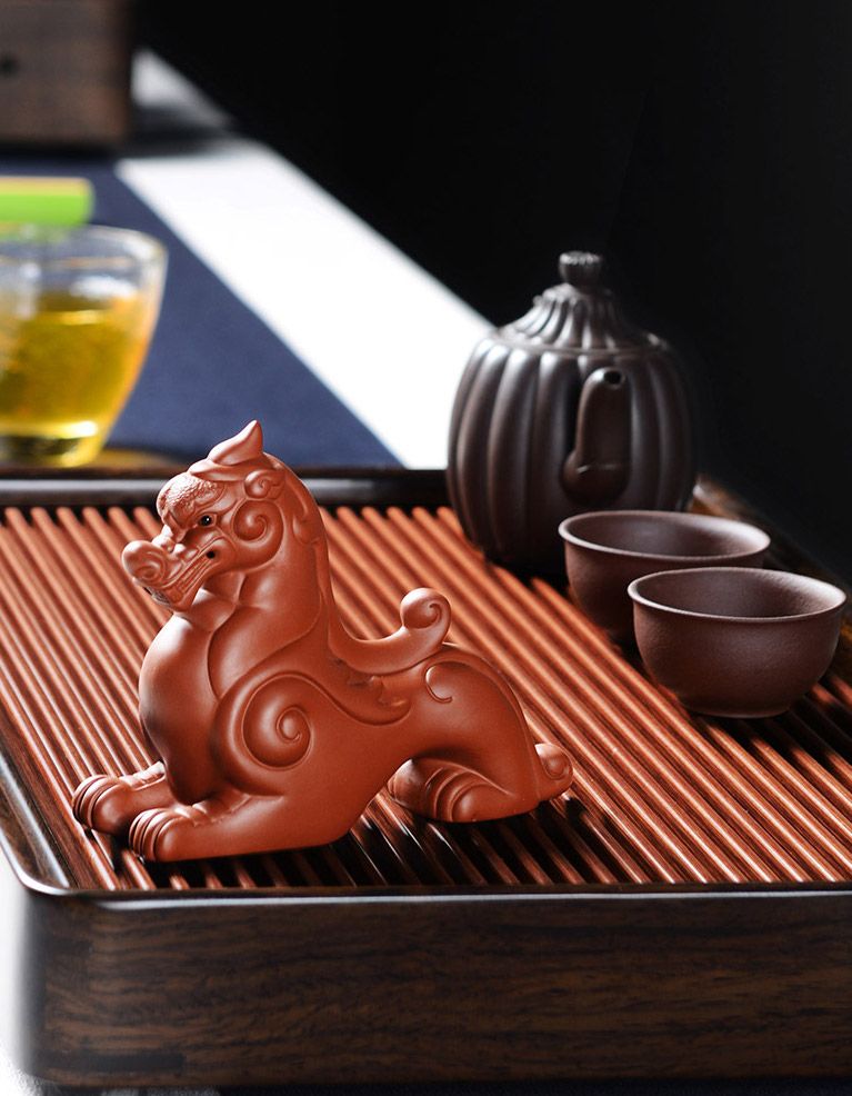 Trà sủng hình kỳ lân được chế tác theo hình ảnh của loài sinh vật huyền bí trong thần thoại Trung Quốc với đầu rồng, thân sư tử. Loài vật thường xuất hiện những lúc hòa bình và khi đặt trên bàn trà được cho là sẽ mang lại sự bình yên trong cuộc sống.