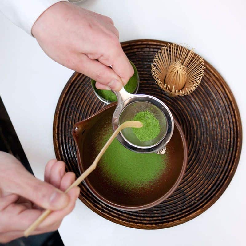 - Bước 1: Bạn cần dùng chasakun để múc khoảng 2 muỗng bột matcha vào chén. Để đảm bảo bột không bị vón cục, bạn có thể rây qua bột matcha.