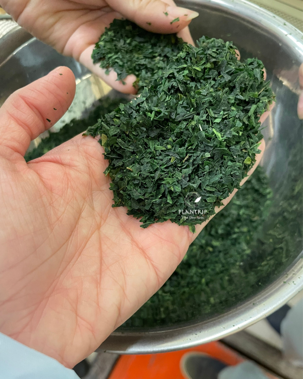 Plantrip Cha tận mắt thấy gân lá trà đã được tách ra, chuẩn bị cho quá trình nghiền bột