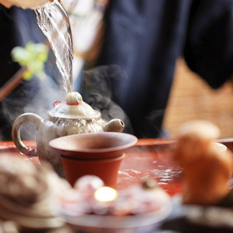 Siêu nước reo lên lục bục. Nguyễn Tuân nhổm người lên đặt tẩu thuốc xuống bàn, lắng tai nghe tiếng reo của nước, rồi gắp chiếc ấm ra, móc túi áo ngực lấy một phong chè Hồng Đào nhỏ bằng nửa bao thuốc cẩn thận cho vào ấm và đợi tới khi thấy tiếng reo của nước nhẹ đều và xuất hiện từ đầu vòi ấm một làn hơi mỏng bay ra, ông mới nhấc siêu nước rót vào ấm.