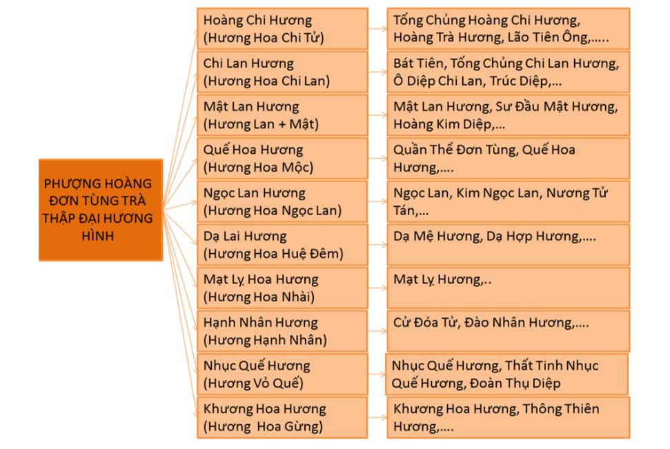 Bảng phân loại trà Phượng Hoàng Đơn Tùng theo tên gọi.